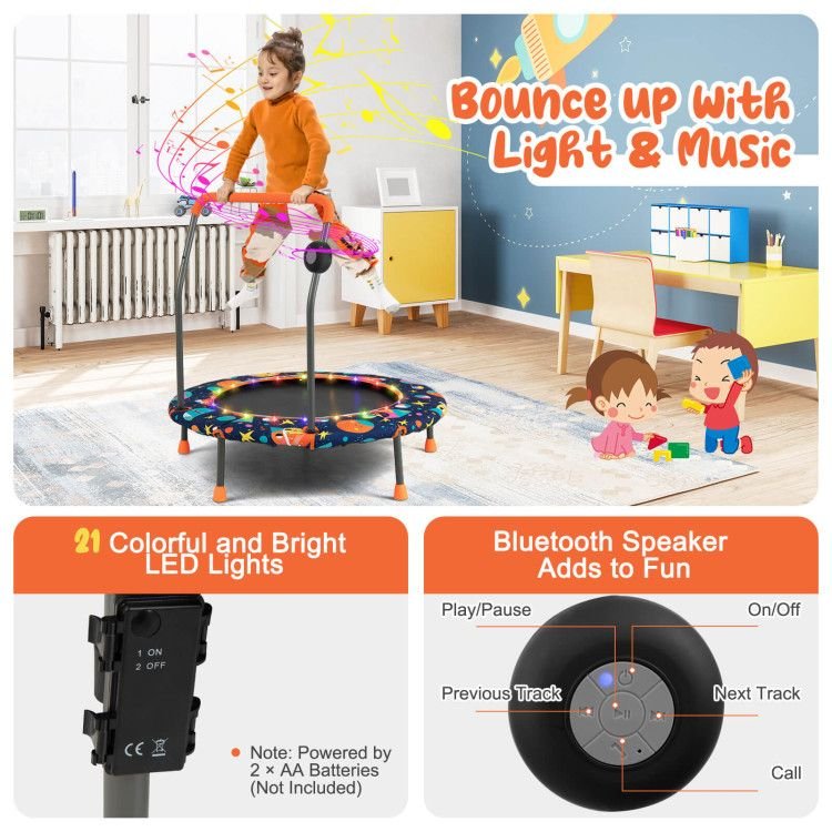 1.Mini Trampoline with Music and Lights: Equipped with 21 colorful and bright LED lights around the edge of the jumping mat (2 AA batteries required, not included), this trampoline can attract kids' eyes instantly. Besides, the detachable Bluetooth speaker with functions of switch/pause/answering phone calls enables toddlers to enjoy pleasant music while jumping.